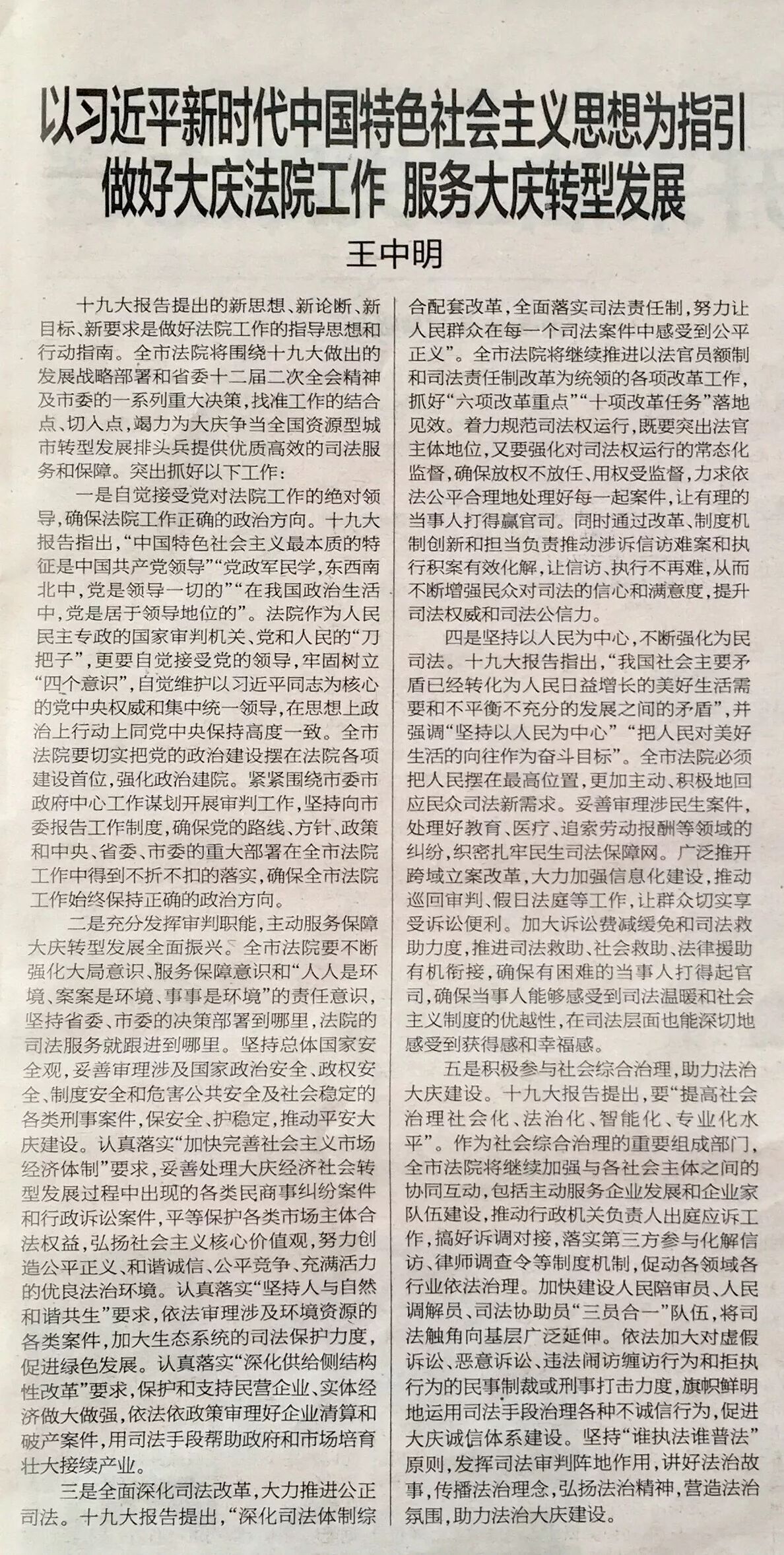 十九大报告提出的新思想、新论断、新目标、新要求是做好法院工作的指导思想和行动指南。全市法院将围绕十九大作出的发展战略部署和省委十二届二次全会精神及市委的一系列重大决策,找准工作的结合点、切入点,竭力为大庆争当全国资源型城市转型发展排头兵提供优质高效的司法服务和保障。突出抓好以下工作: