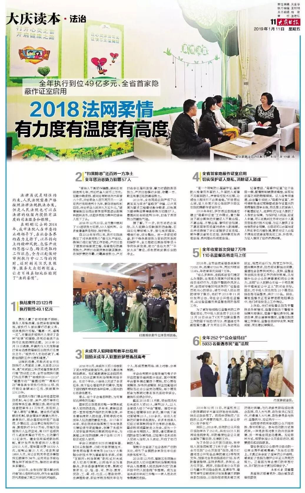 在刚刚过去的2018年,大庆法院人在市委的正确领导下,在社会各界的鼎力支持下,以昂扬向上的精神风貌、包容开放的思想心态、踏实进取的工作状态,全力以赴做好审判执行中心工作的同时,还时刻关注民生保障、服务大众创新创业,让老百姓真切地体验到了“法网柔情”。