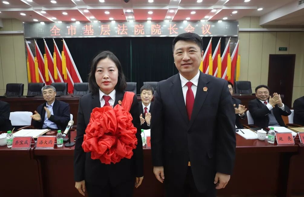 2月18日,大庆中院召开全市基层法院院长会议,其中一项重要议程就是通报表彰入选“全省法院办案质效百强”法官,党组书记、院长洛大雨为中院办案质效“百强”法官张余佩戴红花。