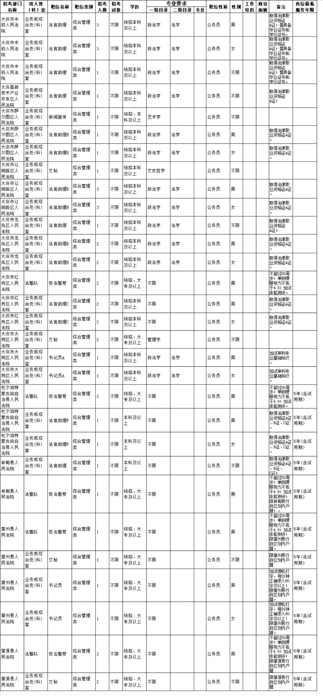 2019年,大庆两级法院计划招录公务员49人。其中,市中院计划招录7人,10个基层法院共计划招录42人。捆绑类岗位招录20人,非捆绑类岗位招录29人。