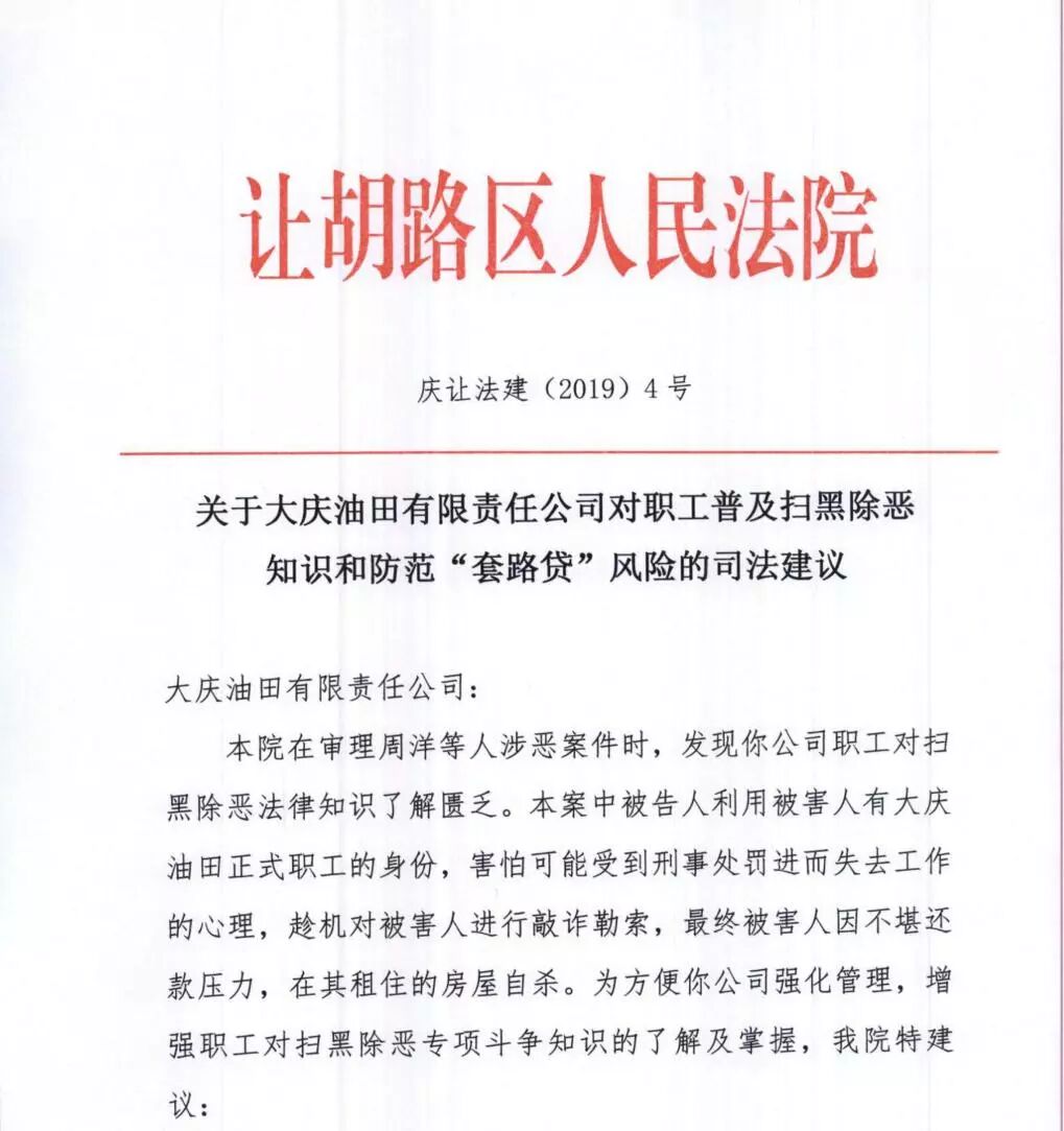 大庆师范学院高度重视让胡路区法院的司法建议,复函提出将做好四方面工作:一是抓预防,继续做好承诺监督管理工作。集中排查清理各类借贷小广告,实行不良“套路贷”举报制度;持续在新生中开展签订“拒绝套路贷承诺书”活动;加强门卫管理、校园巡逻、技防建设和安保反恐演练,维护学校正常秩序。二是抓教育,继续做好宣传防范动员工作。以海报、展板、广播、微信等形式向学生发布理性对待“套路贷”的相关信息,让定期开展“套路贷”风险防范专项主题教育活动成为一种常态。三是抓引导,继续做好思想政治教育工作。提高学生的法律意识和贷款安全意识,树立学生的诚信意识和信用意识。四是抓帮扶,继续做好困难资助工作。通过“奖、贷、助、补、减”及社会资助等多种方式帮助家庭经济困难学生解决好学费、基本生活费、住宿费等方面的困难,坚决避免困难学生为筹集学习生活必须费用而卷入不良校园贷和网络电信诈骗的事件。