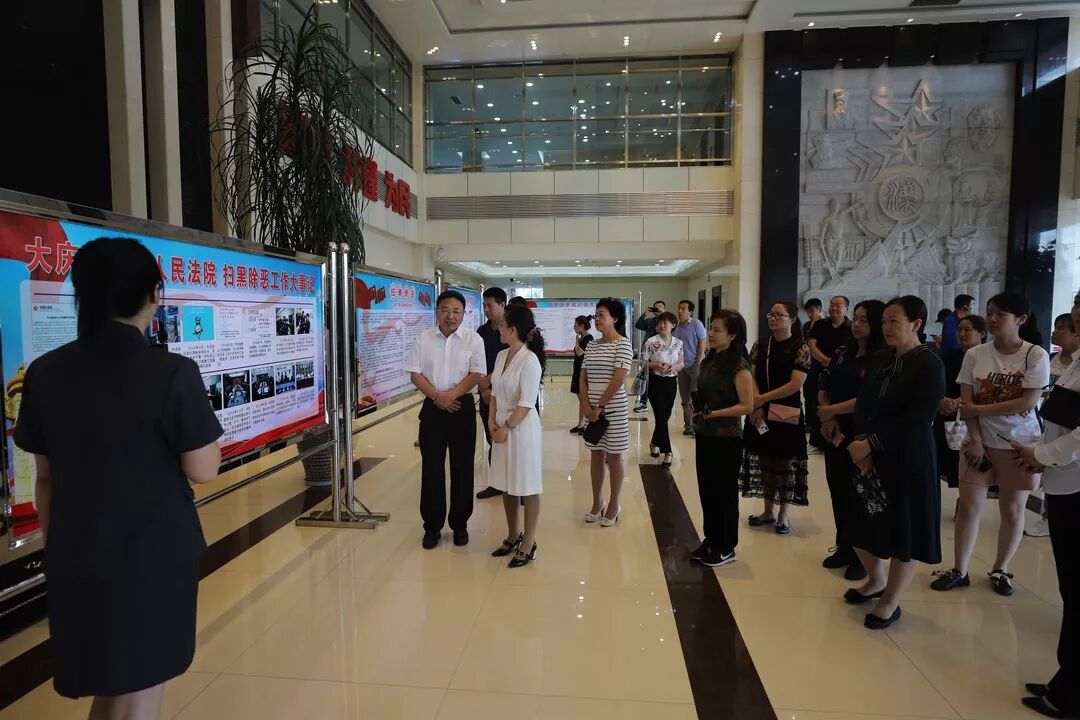 在法治文化展厅,讲解员结合宣传展板,向大家详细解读扫黑除恶专项斗争的目标任务、重大意义、基本原则等内容,并介绍大庆中院扫黑除恶专项斗争工作开展情况。