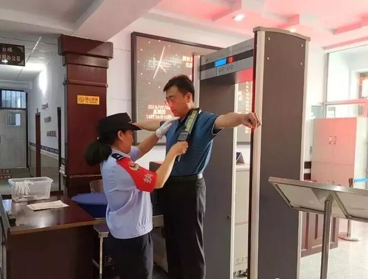 刘登斌走进林甸县法院,值勤法警要求其提供身份证件,随后手持设备对其进行全身检查,并要求其将打火机放入收纳箱中。