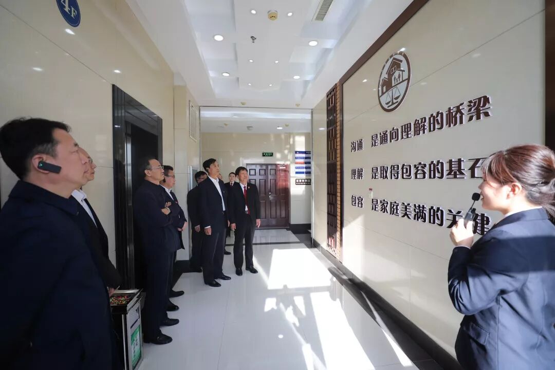 在家事文化长廊,大家对古典与现代相结合的“中国红”风格设计连连称赞,对大庆中院在家事审判工作中做出的努力和探索由衷敬佩,对彰显柔性司法、温情司法理念,营造的温馨和谐家事审判氛围给予高度评价。