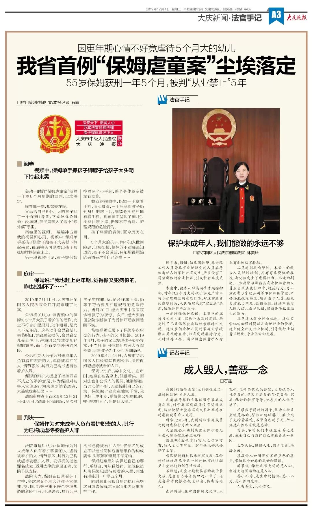 2019年4月24日,大庆市萨尔图区人民检察院提起公诉,指控保姆犯虐待被看护人罪。