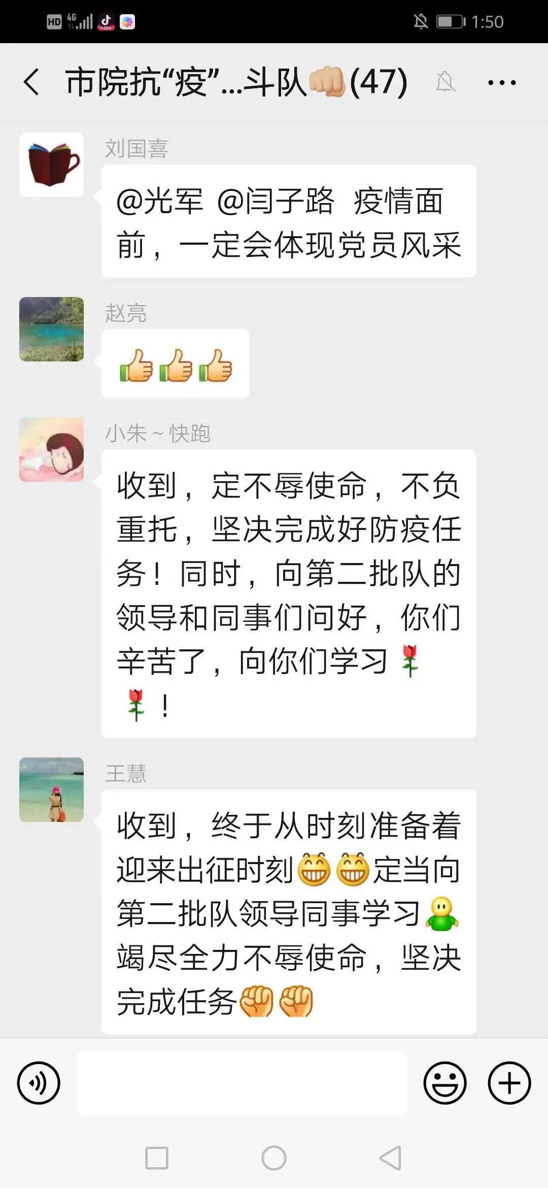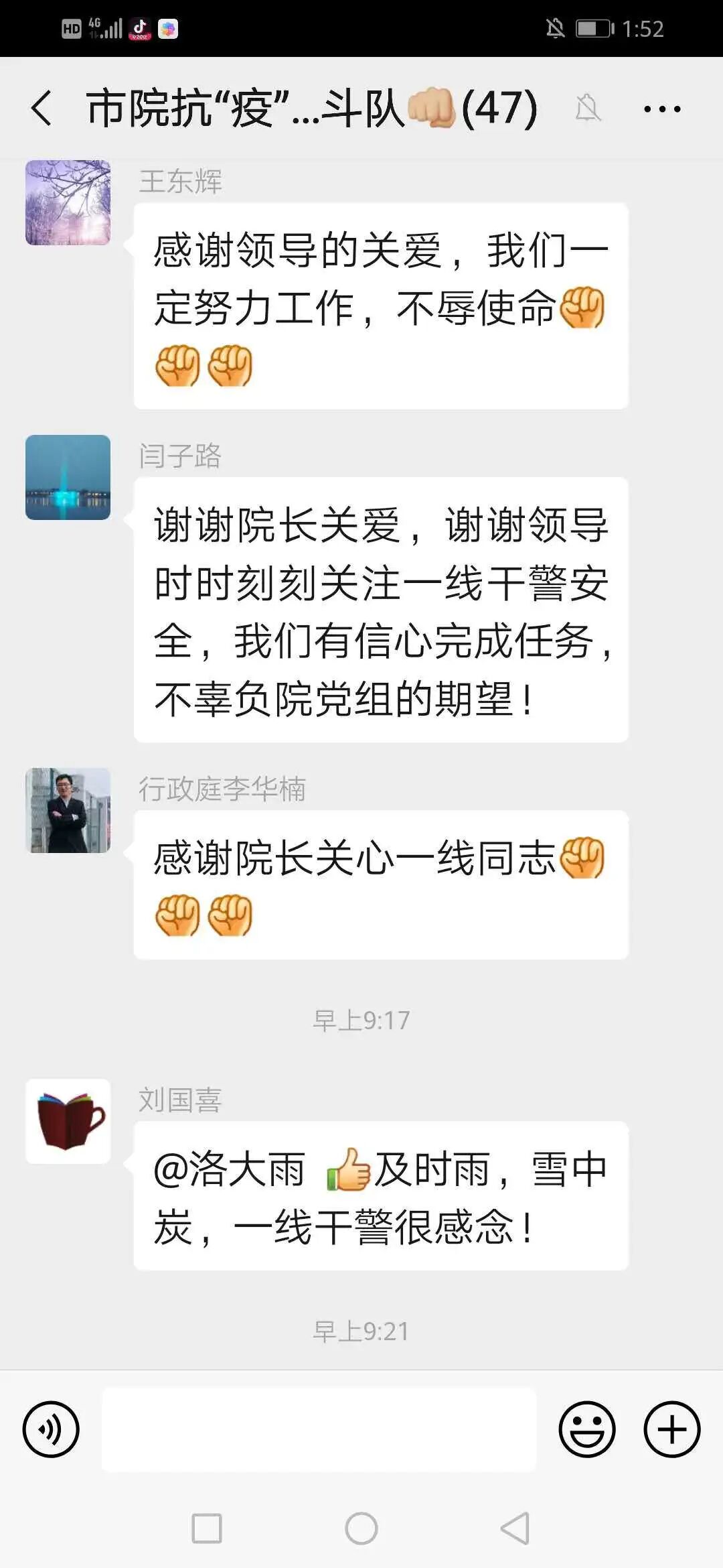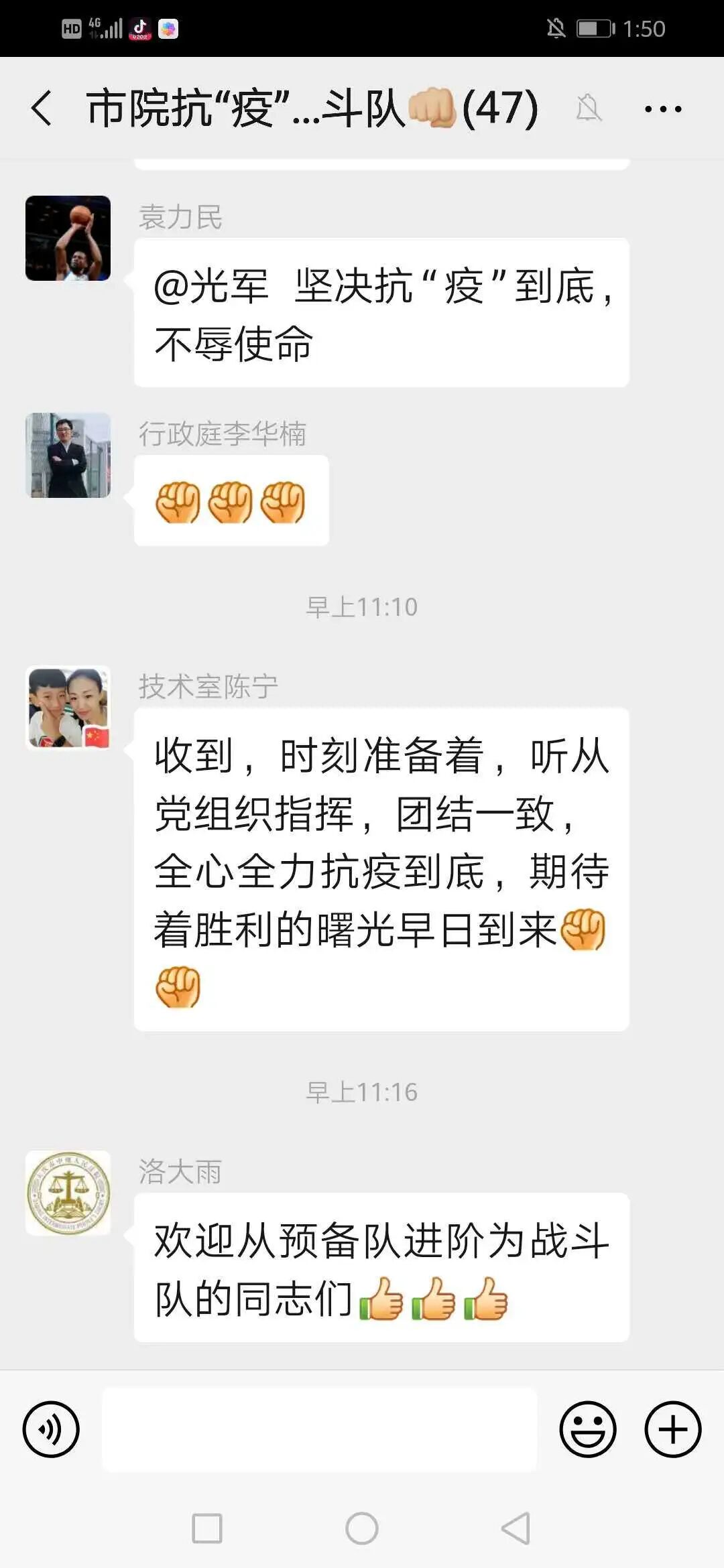 三是希望大家勇往直前、同心协力。坚决抗“疫”到底,疫情不结束,我们不收兵,市法院所有党员都要轮流下沉到一线参与疫情防控。你们战斗队员冲锋在抗“疫”一线,顶风雪、冒风险,守护着一方群众的平安健康,留守干警虽然不能与你们并肩作战,但是我们的心始终是在一起的,我们也一定会全力以赴、毫不懈怠地做好审判执行、宣传引导、后勤保障等其他工作,确保疫情防控和业务工作两手抓、两不误。