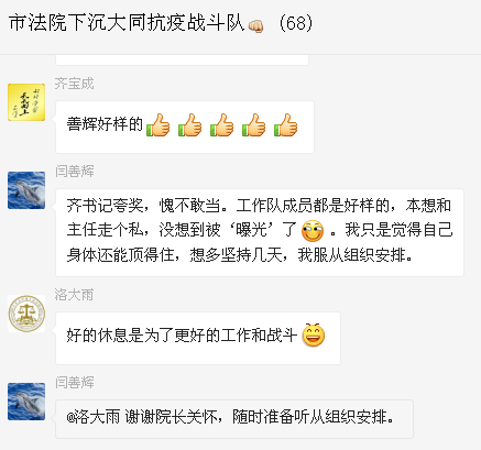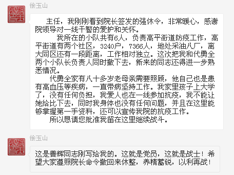 从目前形势看,“抗疫”斗争形势依然严峻,大家必须做好长期斗争的准备。院党组决定分批撤换休息,谢洪程等七名同志向院党组请求继续坚守一线,不获全胜不收兵。院党组认为,身体是革命的本钱,不能以牺牲健康为代价连续作战,只有恢复体能和精力,才能更好地工作。