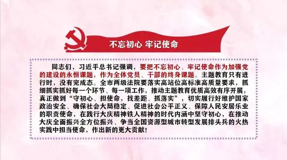 2019年10月18日,大庆中院党组书记、院长洛大雨以“坚守法院人的初心 担当新时代的使命”为题,作主题教育专题党课报告。