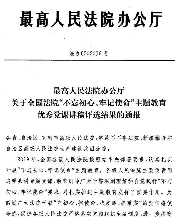近日,最高人民法院关于全国法院“不忘初心、牢记使命”主题教育优秀党课讲稿评选结果揭晓,大庆市中级人民法院党组书记、院长洛大雨的专题党课报告《坚守法院人的初心 担当新时代的使命》获评全国法院“不忘初心、牢记使命”主题教育优秀党课讲稿。