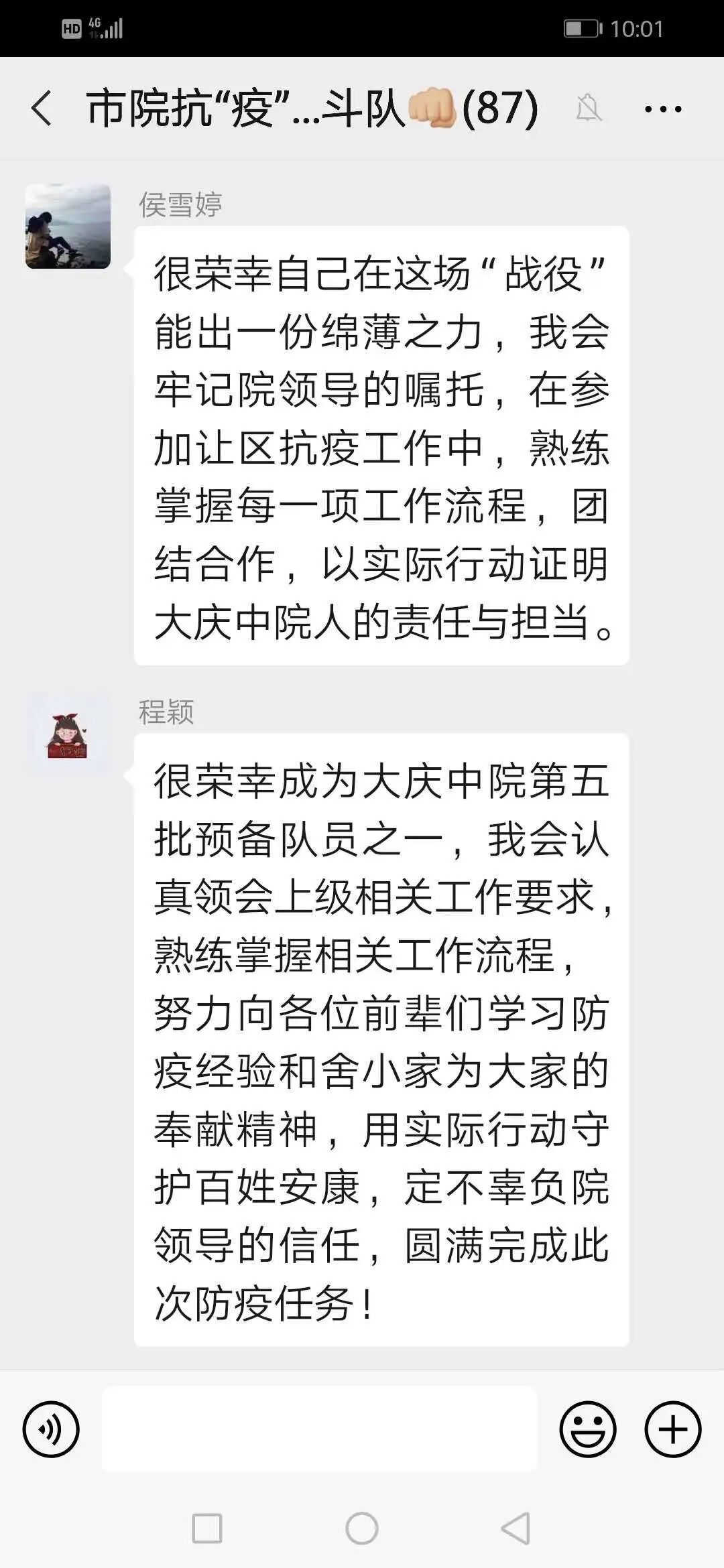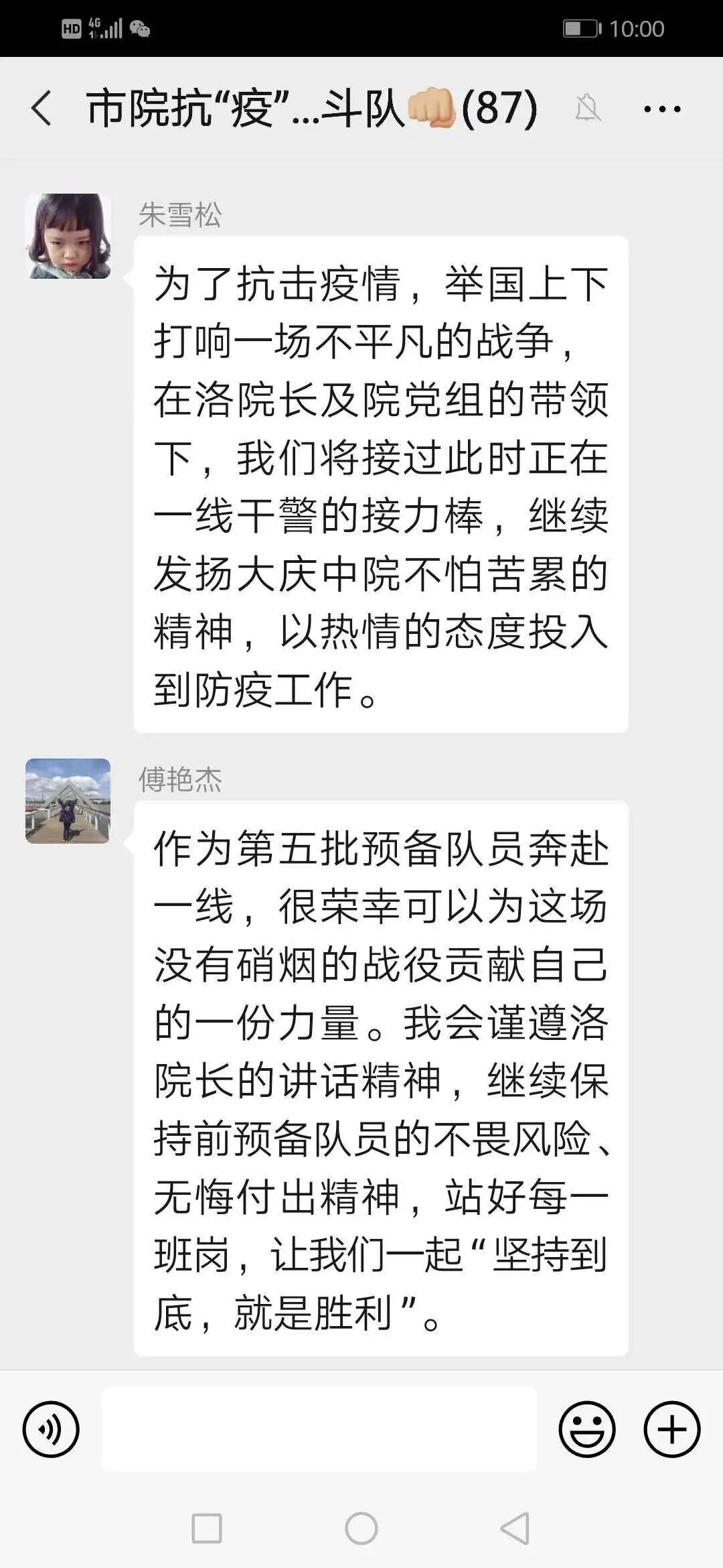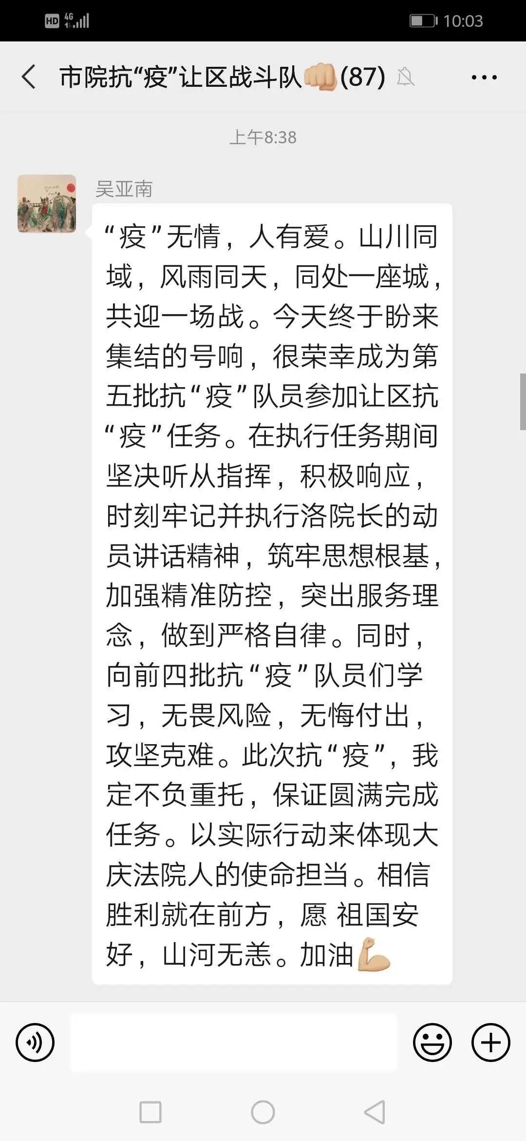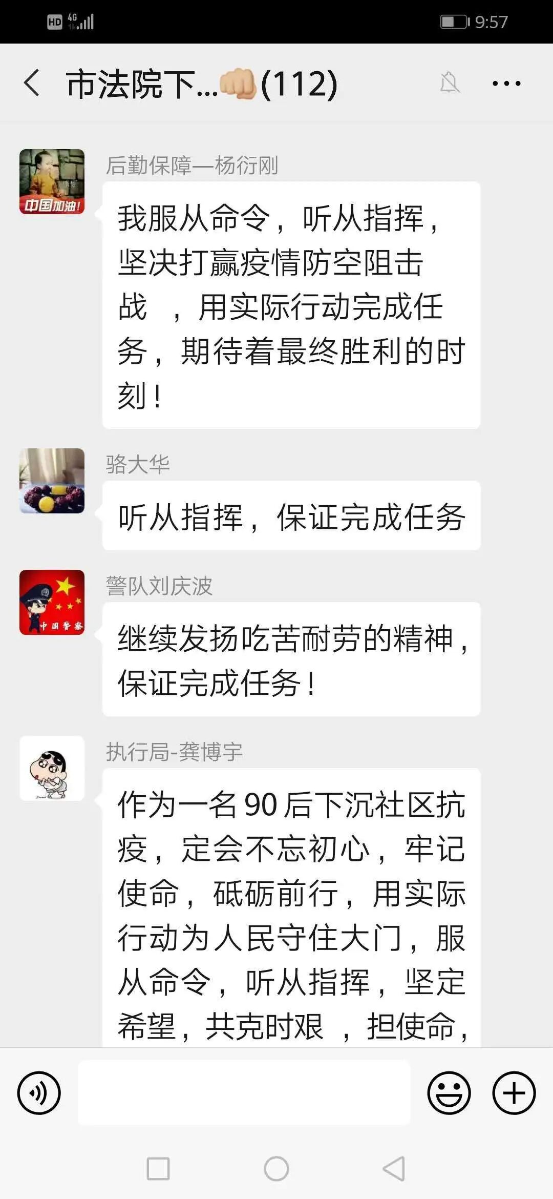 疫情就是命令,防控彰显担当。国家有战,我们每个人都是战士。为抗击疫情, 我院已先后派出四批(包括法警支队)共112名干警奔赴街道社区一线岗位开展疫情防控工作。这些同志无畏风险,无悔付出,攻坚克难,以实际行动体现了大庆法院人的使命担当。