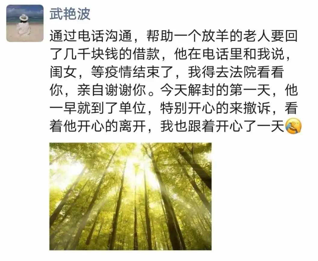 近日,老农朱某来法院撤诉。他向武艳波连连道谢:“好法官!帮我去了这块心病!”