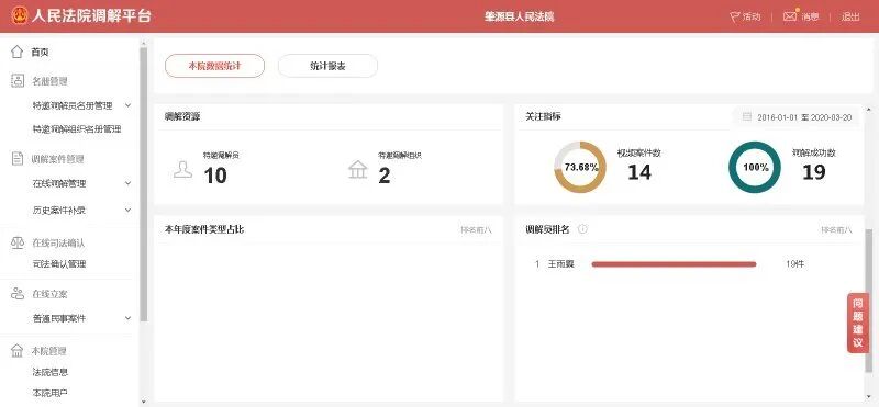 明确2020年审判总体任务及均衡结案工作要求。按照上级法院部署,结合全院疫情期间实际工作情况,进一步对任务进行统筹调整,细化分解至条线和各部门。诉讼服务中心加强诉调对接,强化案件源头分流;各审判团队强化网络办案、远程办案,有序准备线下庭审各项保障工作。