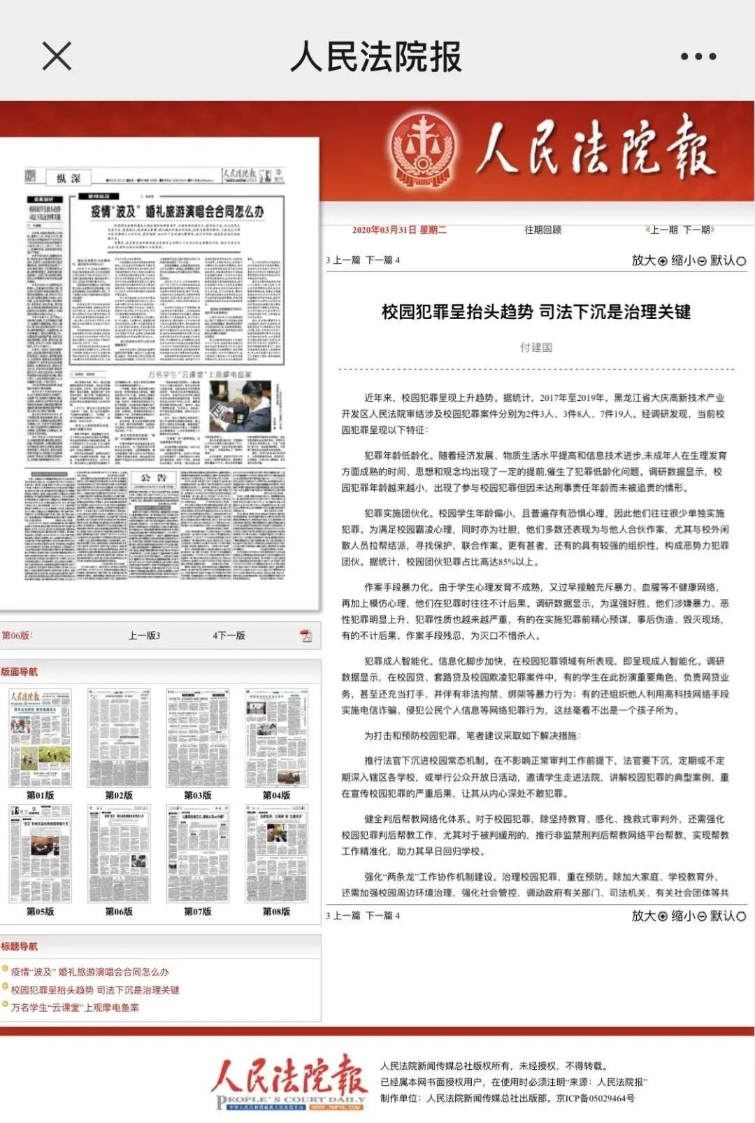 3月31日,《人民法院报》刊登高新区法院法官付建国撰写的文章《校园犯罪呈抬头趋势 司法下沉是治理关键》。