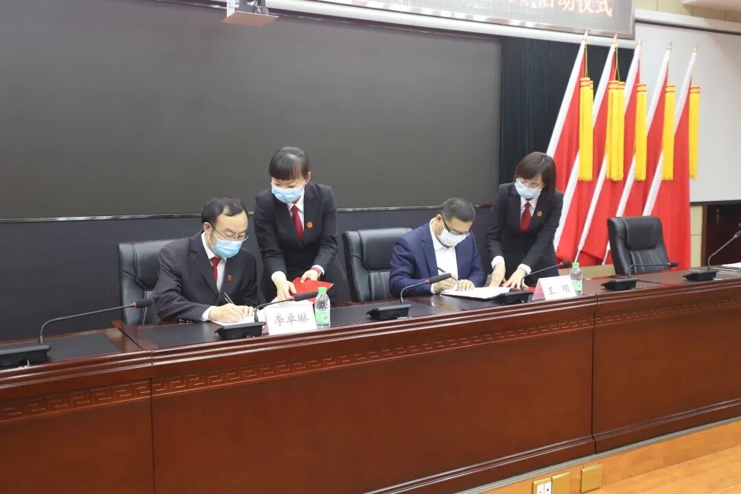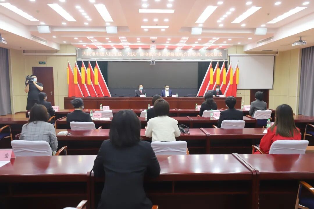 大庆中院党组成员、副院长李卓琳与大庆广播电视台党组书记、台长王明签署《战略合作协议》,并为“四大帮办调解工作室”揭牌。