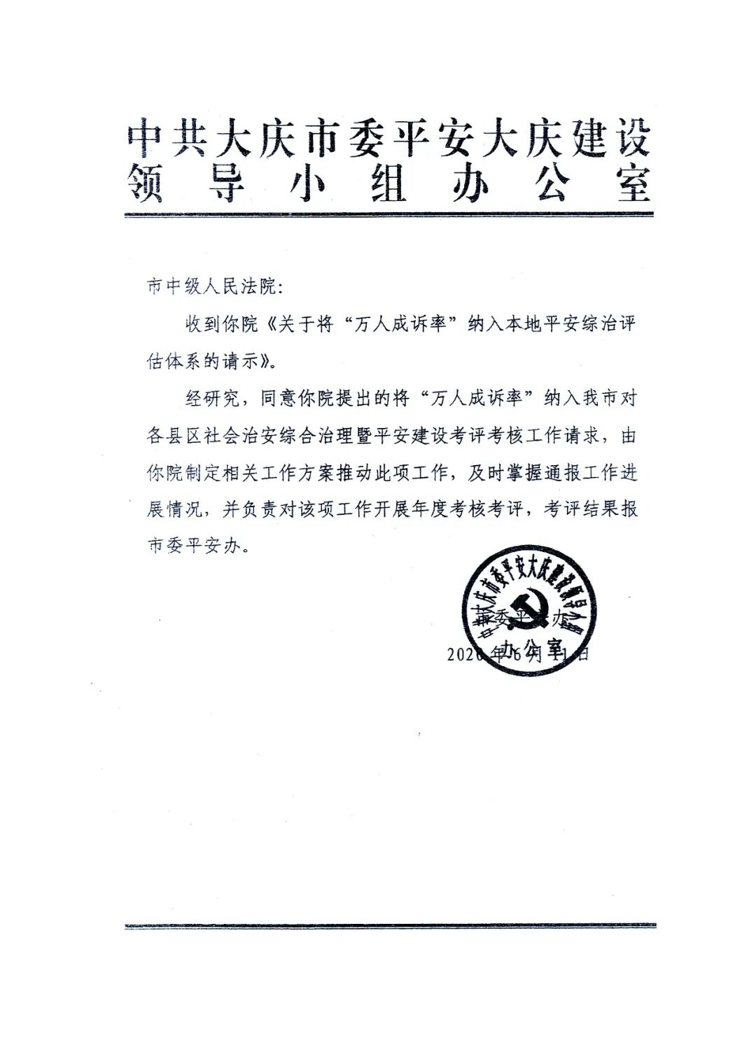 省法院党组书记、院长石时态批示:大庆推进多元解纷机制建设的经验做法值得总结推广。