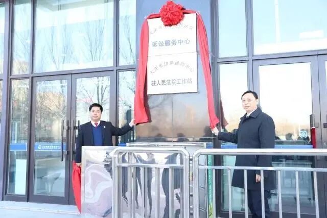 ▲ 市司法局局长刘勇与大庆中院副院长赵亮共同为法律援助中心驻大庆中院工作站揭牌
