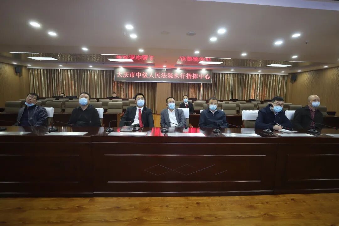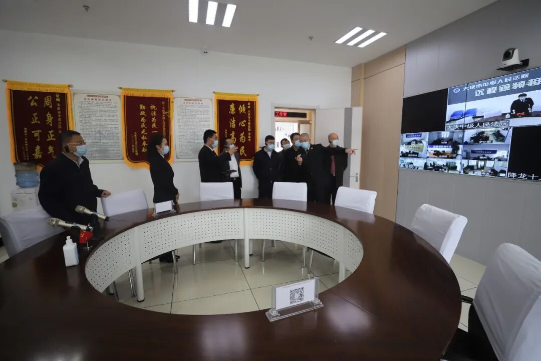 在执行指挥中心,大庆中院信息中心工作人员现场演示公检法业务协同平台卷宗流转程序。大家共同观摩一起远程庭审,并就平台传输方式、网络安全、三级等保等问题进行深入交流。