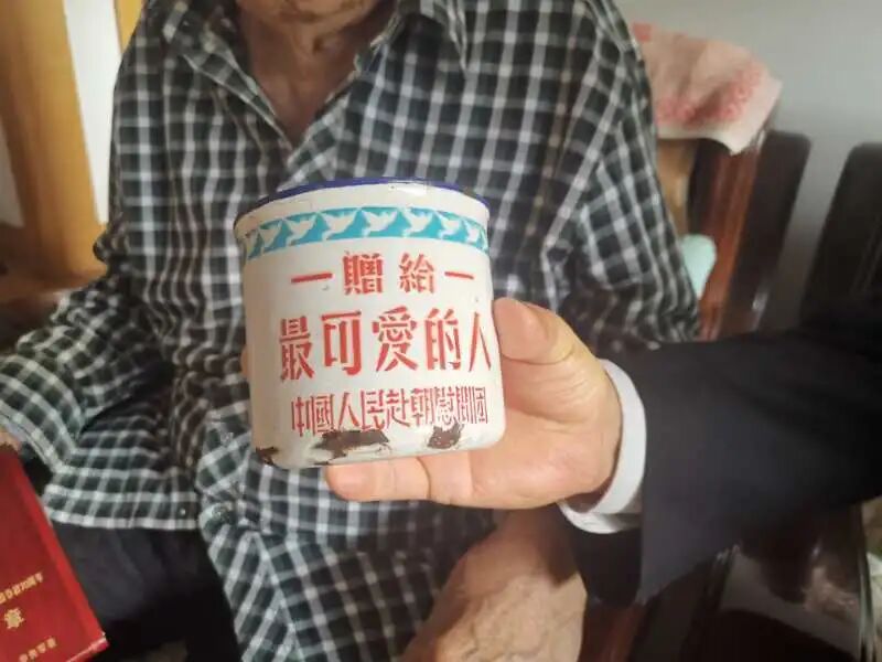 离休干部宋玉书老人今年已经96岁高龄,曾参加过解放战争中的两大战役和抗美援朝战争。交谈中,他让家人拿出了珍藏六十多年之久、已经布满铁锈的水杯。老人动情地讲,抗美援朝一次战斗中,一个炮弹落在他附近,卧倒时弹片击中了这个挂在腰间的水杯,打坏了杯子的把手,他将这个替他挡了弹片的“救命水杯”一直珍藏至今。讲到此时,老人眼里已泛起泪光,大家备受触动。